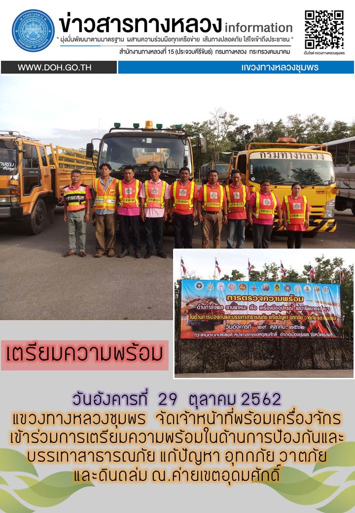 จัดเจ้าหน้าที่พร้อมเครื่องจักร เข้าร่วมการเตรียมความพร้อมในด้านการป้องกันและบรรเทาสาธารณภัย แก้ปัญหา อุทกภัย วาตภัย