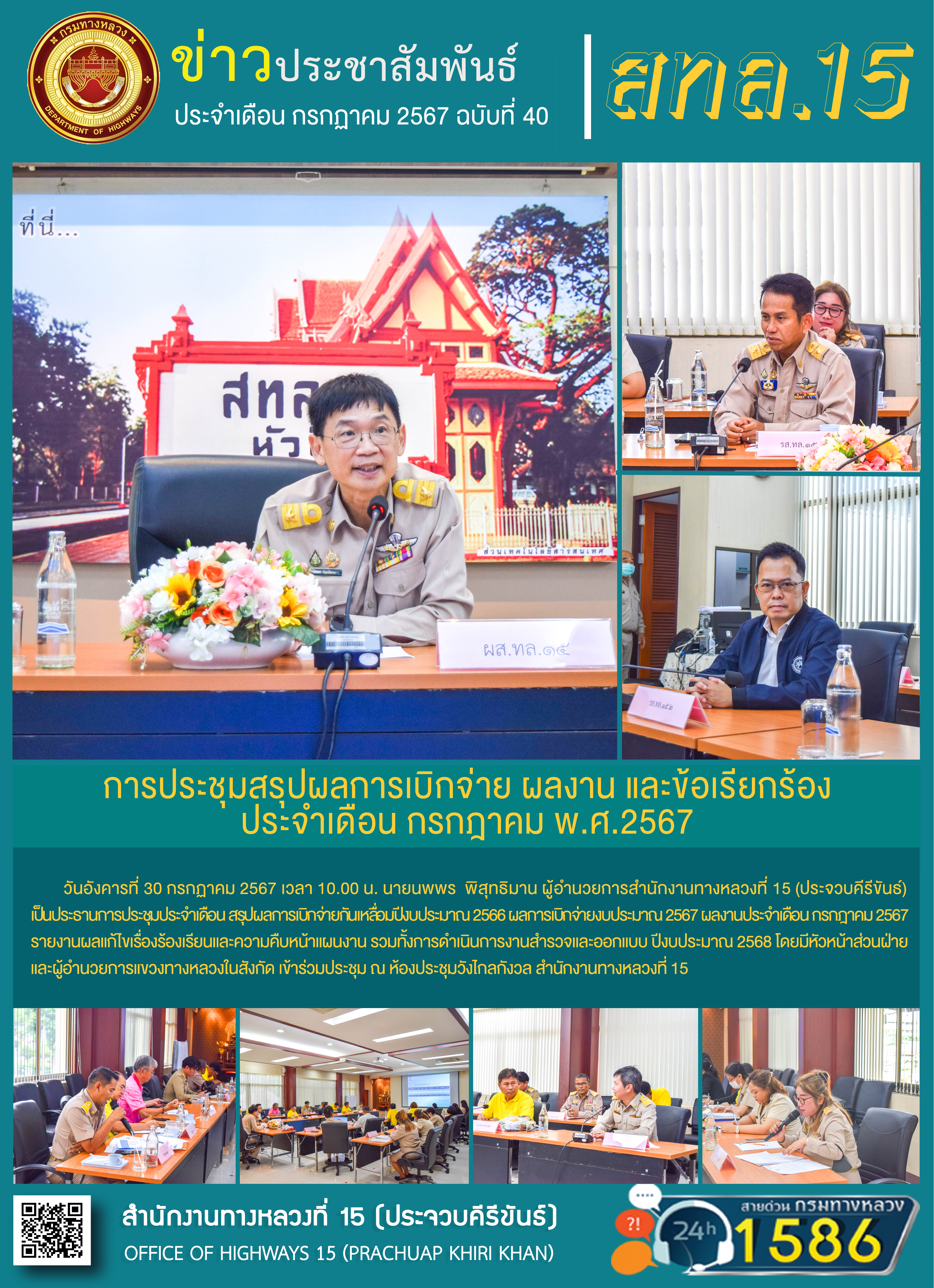 วันอังคารที่ 30 กรกฎาคม 2567 เวลา 10.00 น. นายนพพร พิสุทธิมาน ผู้อำนวยการสำนักงานทางหลวงที่ 15 (ประจวบคีรีขันธ์) เป็นประธานการประชุมประจำเดือน สรุปผลการเบิกจ่ายกันเหลื่อมปีงบประมาณ 2566 ผลการเบิกจ่ายงบประมาณ 2567 ผลงานประจำเดือน กรกฎาคม 2567 รายงานผลแก้ไขเรื่องร้องเรียนและความคืบหน้าแผนงาน รวมทั้งการดำเนินการงานสำรวจและออกแบบ ปีงบประมาณ 2568 โดยมีหัวหน้าส่วนฝ่าย และผู้อำนวยการแขวงทางหลวงในสังกัด เข้าร่วมประชุม ณ ห้องประชุมวังไกลกังวล สำนักงานทางหลวงที่ 15