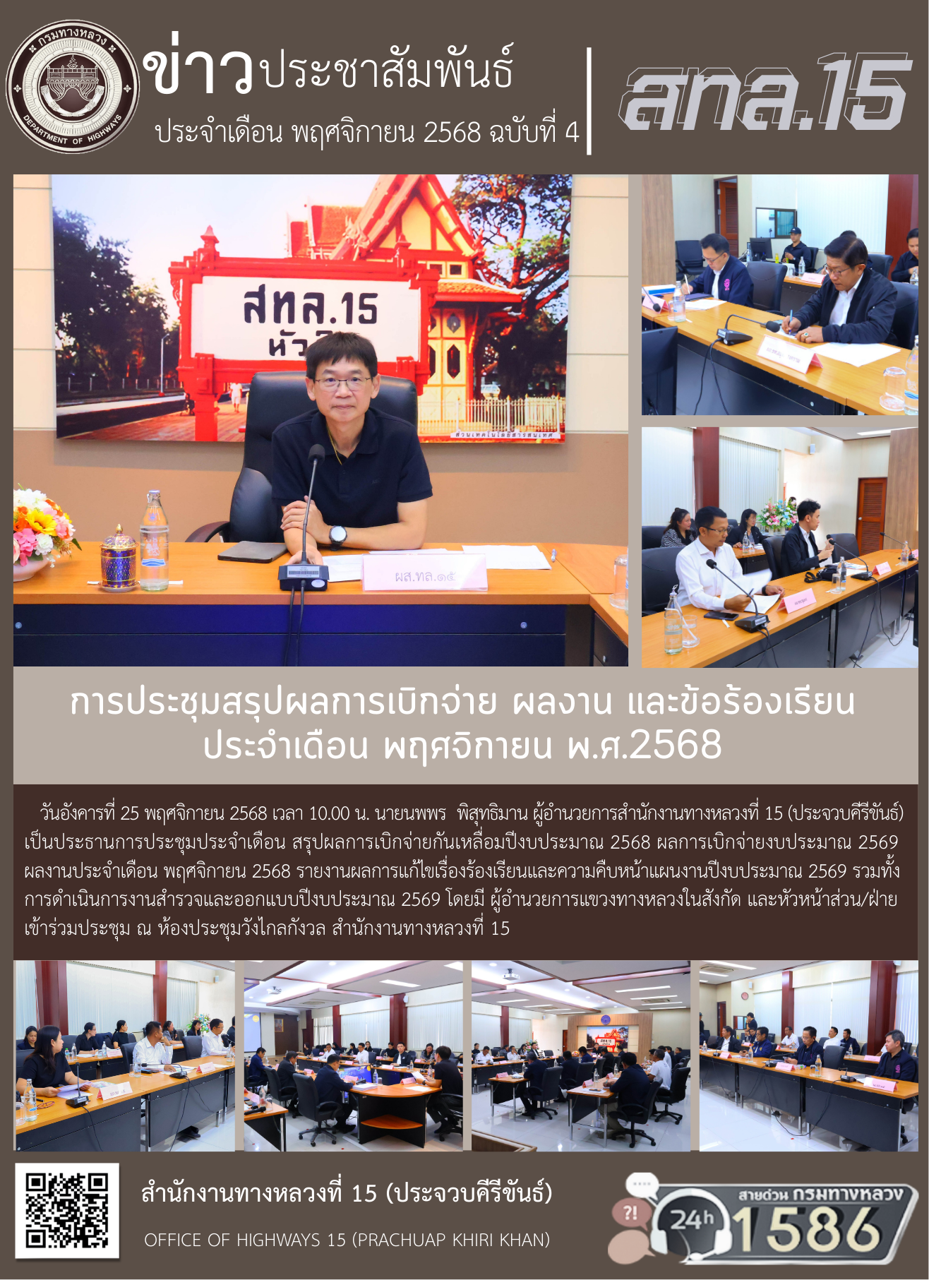 วันอังคารที่ 25 พฤศจิกายน 2568 เวลา 10.00 น. นายนพพร พิสุทธิมาน ผู้อำนวยการสำนักงานทางหลวงที่ 15 (ประจวบคีรีขันธ์)เป็นประธานการประชุมประจำเดือน สรุปผลการเบิกจ่ายกันเหลื่อมปีงบประมาณ 2568 ผลการเบิกจ่ายงบประมาณ 2569 ผลงานประจำเดือน พฤศจิกายน 2568 รายงานผลการแก้ไขเรื่องร้องเรียนและความคืบหน้าแผนงานปีงบประมาณ 2569 รวมทั้งการดำเนินการงานสำรวจและออกแบบปีงบประมาณ 2569 โดยมี ผู้อำนวยการแขวงทางหลวงในสังกัด และหัวหน้าส่วน/ฝ่ายเข้าร่วมประชุม ณ ห้องประชุมวังไกลกังวล สำนักงานทางหลวงที่ 15