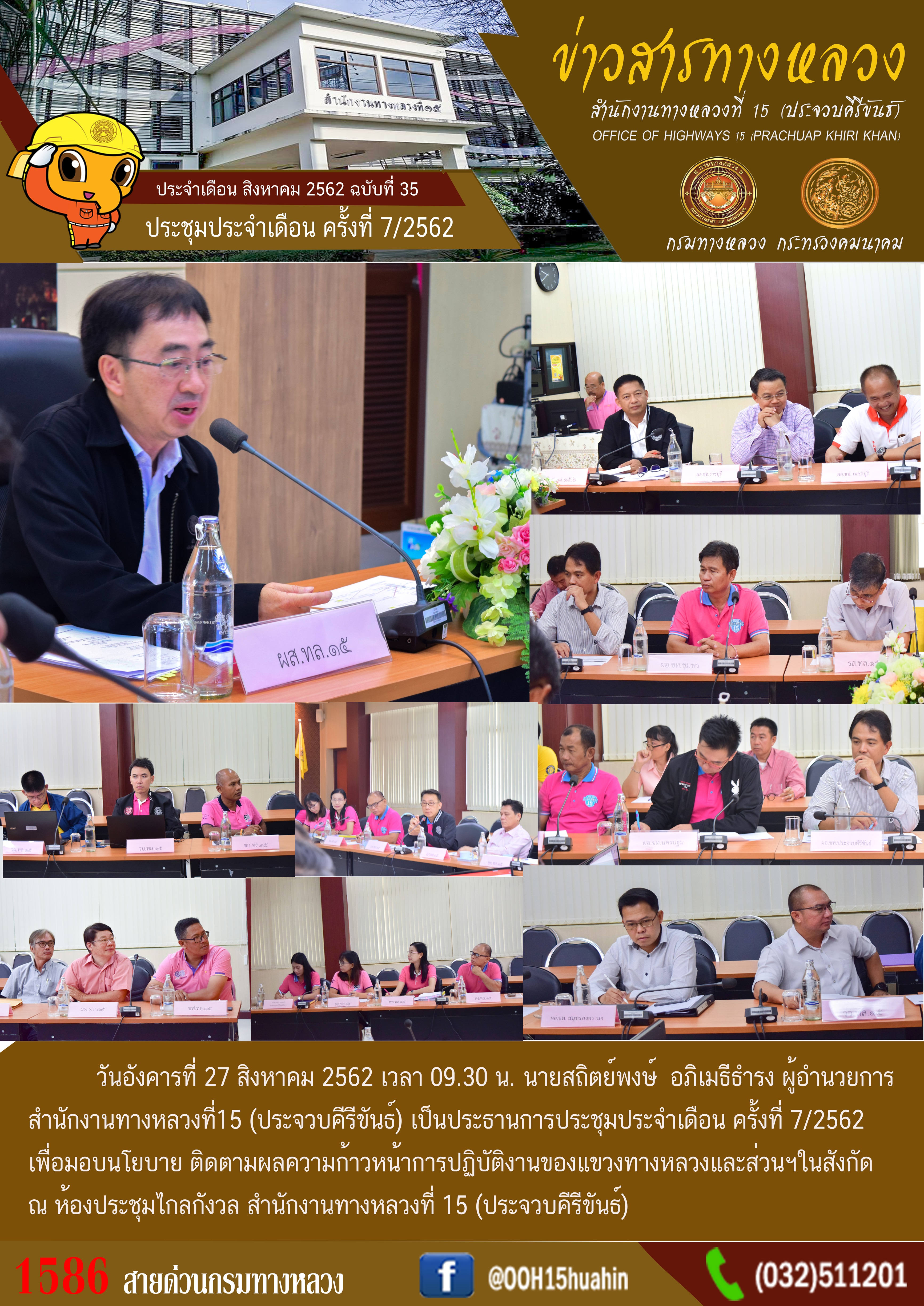 วันอังคารที่ 27 สิงหาคม 2562 เวลา 09.30 น. นายสถิตย์พงษ์ อภิเมธีธำรง ผู้อำนวยการ สำนักงานทางหลวงที่15 (ประจวบคีรีขันธ์) เป็นประธานการประชุมประจำเดือน ครั้งที่ 7/2562 เพื่อมอบนโยบาย ติดตามผลความก้าวหน้าการปฏิบัติงานของแขวงทางหลวงและส่วนฯในสังกัด ณ ห้องประชุมไกลกังวล สำนักงานทางหลวงที่ 15 (ประจวบคีรีขันธ์)