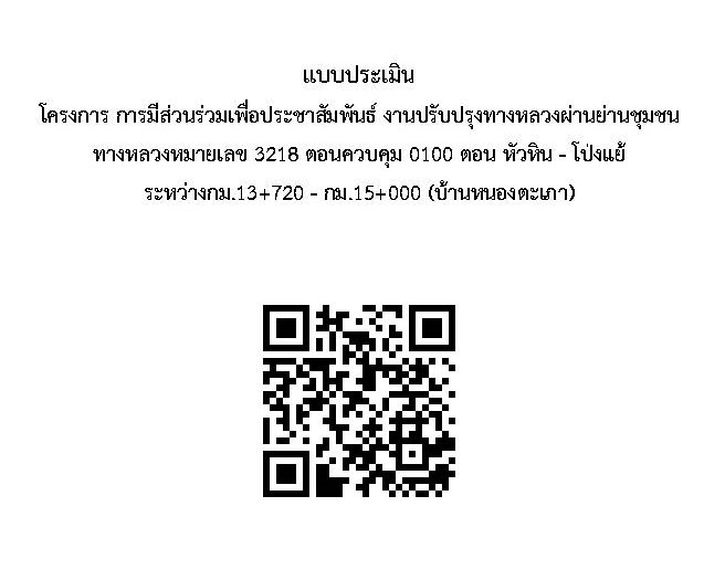 ขอความร่วมมือจากท่าน ร่วมแสดงความคิดเห็นเกี่ยวกับโครงการดังกล่าว โดยการตอบแบบประเมินออนไลน์ผ่านการแสกน QR CODE เพื่อรวบรวมความเห็นของท่านและนำไปปรับปรุงการดำเนินการต่อไป