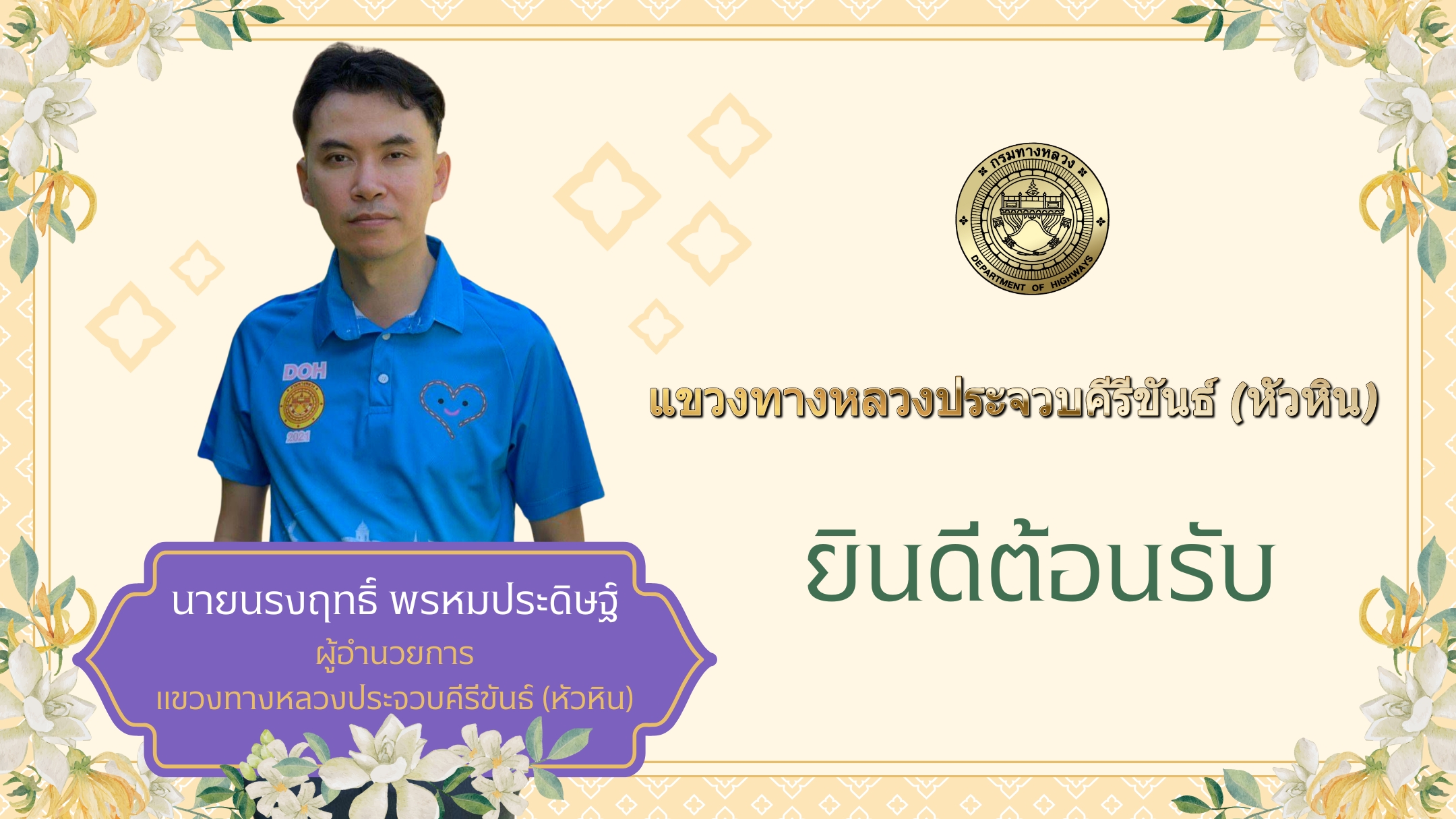 ยินดีต้อนรับ นายนรงฤทธิ์ พรหมประดิษฐ์ ได้ย้ายมาดำรงตำแหน่ง ผู้อำนวยการแขวงทางหลวงประจวบคีรีขันธ์ (หัวหิน)